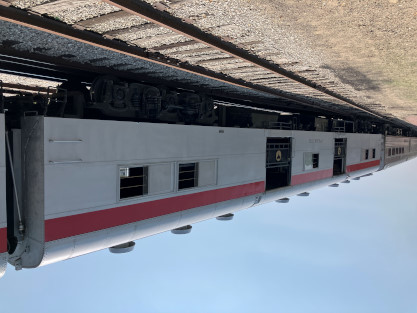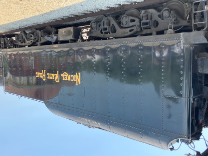 FWRX open air baggage car 3671 "John H. Emery, nee Santa Fe 3671 built by the American Car & Foundry in 1955 that once travelled some of the railroad's most celebrated passenger trains. "John H. Emery" was repurposed into an open-air car in 2022, enabling riders to enjoy the sights and sounds of historic railroading. This stainless steel baggage car operated on The Chief, Super Chief, El Capitan, Grand Canyon, and many others. These trains were part of the Golden Age of Railroading, circa 1920-1960, and this car routinely carried the shipments, personal effects, and luggage for passengers and railroad customers on a 2,227-mile journey between Chicago and Los Angeles. Between Santa Fe and later Amtrak, the car is estimated to have accumulated several million miles during its 64 years of regular passenger train service.
