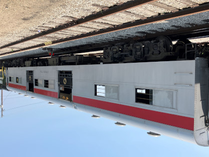 "Dinner in the Diner Nothing could be finer". This car, 8501 "Silver Diner" was built by the Budd Company as their 164. Amtrak dropped the Zephyr name and renumbered it as 8500 and finally 8551. Fort Wayne Railroad Historical Society obtained the car from Amtrak in 2019.