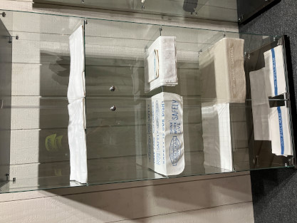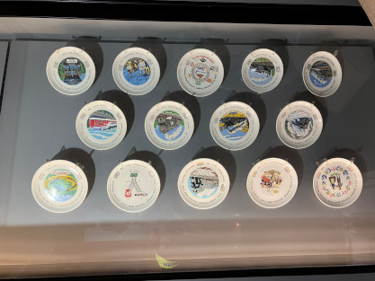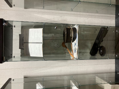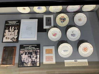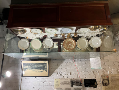 Detail of the 1920-1945 history console with memorabilia and souvenirs.