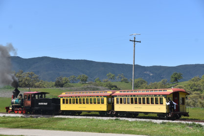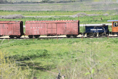 Pacific Coast Railroad 3 pulls its passenger train for photo runby four.