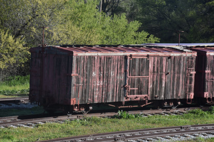 A wooden boxcar used for storage.