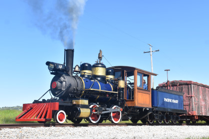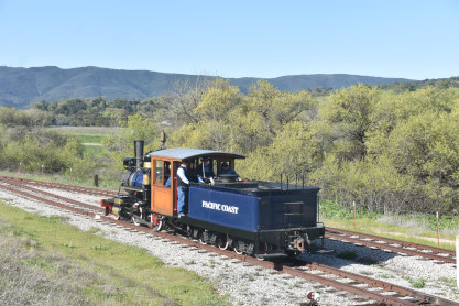 Pacific Coast Railroad 3 pulls the passenger cars.