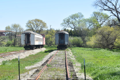 On the left is Southern Pacific interurban coach 2155, built by the Pullman Company in 1924 and on the right is Southern Pacific interurban coach 2085, built by the Pullman Company in 1924. Both were acquired from the Santa Clara Fairgrounds in San Jose.