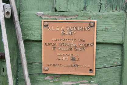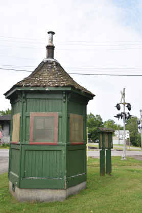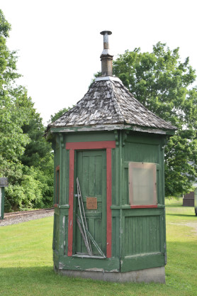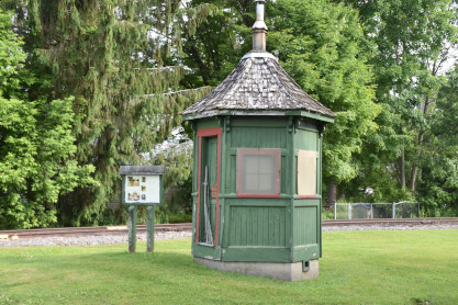 City crossing gates were operated from such as this from 1907 to the 1960s. The Oxford Historical Society dedicated the restored shanty on August 28, 1988, which had been was discovered in a dilapidated condition on the property of Willard Roney, who gave the structure to the society. It took more than five years to locate a suitable site for the shanty and to restore it. Originally there were three such shanties at the Main Street, Merchant Street and Water Street crossings where the railroad passed through the center of the town. These shanties provided shelter and warmth for the persons who were hired by the railroad to stop pedestrian and vehicular traffic as trains approached the crossings. During the heyday of the railroad, there were as many as six regularly-scheduled passenger trains in each direction daily on the Binghamton to Utica division of the Lackawanna railroad. There were numerous freight and milk trains as well. These early guard houses were rectangular in shape. Sometime after 1905, they were replaced by hexagonal buildings from the design seen in this restored shanty. When automatic gates were installed, the watchman's job was eliminated, the shanties abandoned and one by one disappeared.