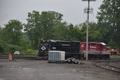 A nice surprise was Owego and Harford Railway U23B 2302, ex. Luzerne and Susquehanna 2302, exx. Lehigh Railway 2302, exxx. Providence and Worcester 2208, exxxx. New York Susquehanna Western 2208, exxxxx. New York Susquehanna and Western 2302, exxxxxx. Big Dog Lines 2208, nee Conrail 2794, built by General Electric in 1977; and R.J. Corman GP9 9009m, nee Baltimore and Ohio 6591 built by Electro-Motive Division in 1958.