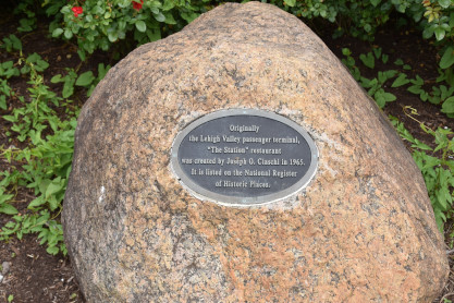 This uniquely-shaped and placed plaque states "Originally the Lehigh Valley passenger terminal, "The Station" restaurant was created by Joseph O. Ciaschi in 1965. It is listed on the National Register of Historic Places".