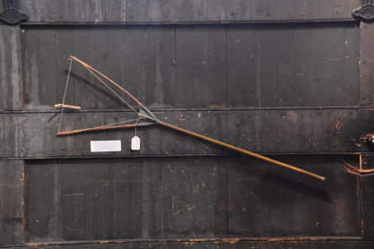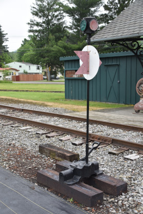 Train order fork from the Erie station at Endicott. The stick was used by railroads to communicate orders to the train engineer. The telegrapher watched for the train from the bay window at the depot and if the dispatcher wanted to send an order a train, the telegrapher would roll up the order, attach it using a slip knot onto the string of the "Y" shaped stick and race to the edge of the train platform. The trainman would grab only the string with the order attached and would then give one copy to the train engineer and one copy to the conductor.