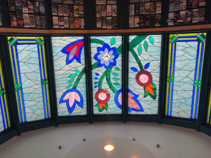 One of the rest areas in New York that Elizabeth visited had a stained-glass window, something that she had never seen at a rest area before.