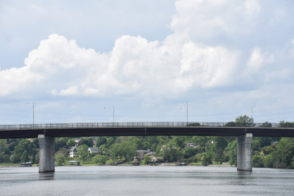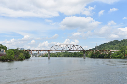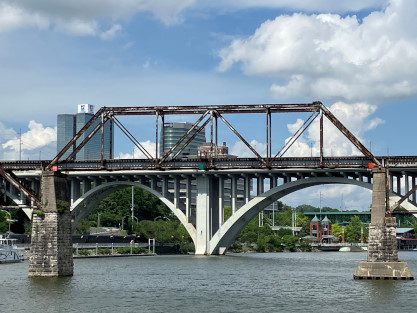 The Norfolk Southern bridge across the Tennessee River complete with a bird's nest on the top right.