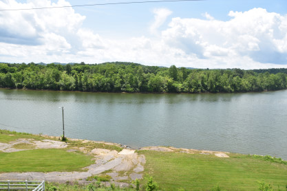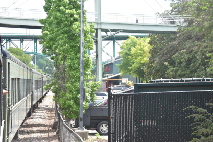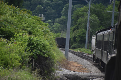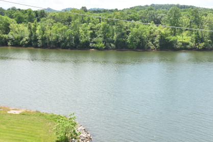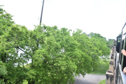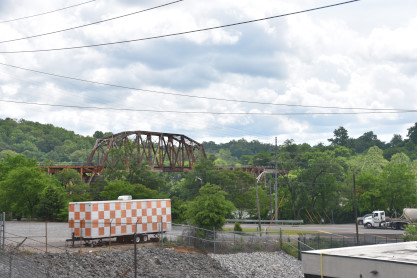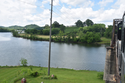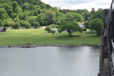 About to cross the Holston River on a three-span Warren through-truss bridge constructed in 1913 from dismantled single-track bridges at Strawberry Plains & Charleston, Tennessee. It is 850 feet above the river.