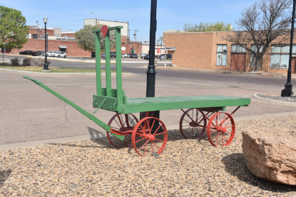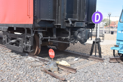 Derailer and a switch stand. We next drove across the state line to Oklahoma and I asked Elizabeth to look on her mobile phone to see if there were any railway displays in the communities we were passing. When we arrived at Hooker, she guided me to a display.