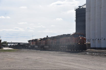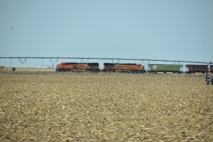 An unidentifiable BNSF grain train at Plevna, Kansas. Our route took us through Kinsley and we decided to re-visit the steam engine here.