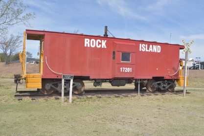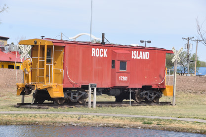 Chicago and North Western caboose 11081, built by International Car in 1965, painted as Rock Island 17201, on display in Centennial Park.