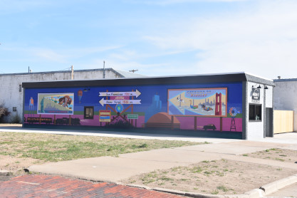 "Destination Home" mural painted by Dave Loewenstein and Freedy Johnston in September 2024. Painted on the newly renovated Midway Market, this unique mural brings together the talents of acclaimed singer-songwriter (and Kinsley native) Freedy Johnston and muralist Dave Loewenstein. The two had never met prior to the project but came together when after a performance in the State Capitol, Freedy was asked by the Kansas Lieutenant Governor if he would be interested in painting a mural in his hometown. The inspiration for the design came from Freedy's desire to highlight Kinsley's unique location as the mid-point between San Francisco and New York. Loewenstein elaborated on this by creating billboards that beckoned people to "Escape to Kansas" and "Getaway to Kinsley". Other features include a portrait of Johnston atop the local grain elevator playing his guitar, a map showing all the other places that are 1,561 miles from Kinsley and steam locomotive filled with colorful characters.