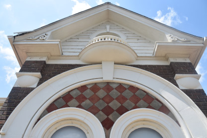 For the Clinchfield Railroad station, the focus of the new town, he fused several styles notably the Beaux-Arts, Italianate and Colonial Revival. The result is a rectangular, one-story, red-brick building with a central clock tower articulated with four chimney-like masses at the corners and at the top, bold Italianate brackets supporting a pyramidal roof. Most of the brickwork is laid in stretcher bond, but the indented central bay of each side of the tower is laid in Flemish bond. The building has corbelled brickwork between arched openings and the roof and on the tower. But for a few of the windows in the tower, all windows and doors are arched. There is a portico at the northwest end. The central portion of the building has a gable roof; mansard roofs cover the southeast wing of the building as well as the portico at the northwest end. The eaves are supported by large knee brackets. There is a small brick balcony supported by brick corbelling below one of the facade windows on the tower.