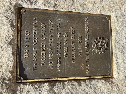 The site of the Great Western Station RR passenger station and near their track where stood the train from which President elect Mr. Lincoln made this farewell address.
