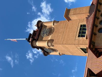 It is set to chime every half hour and was programmed with 33 different chimes. It keeps time by receiving signals from the National Institute of Standards and Technology.