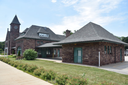 Still in use as a passenger depot, the station has changed little from its original structure. The asymmetrically-planned coursed brownstone structure was built in the Richardsonian Romanesque style, topped by high hipped and gabled roofs. The building is divided into three sections: a 125-foot single-story hip-roofed baggage collection area connected to the main building by a 50-foot-long hip-roofed covered walkway; the lobby, dining, and smoking rooms; and the circular waiting room. The main front gabled section features an arched entrance and second-story bay window, with an apsidal extension surrounded by a veranda. Dominating the station-side façade is a 60-foot high tower housing the station's clock, which was manufactured by Howard Brothers of Boston.