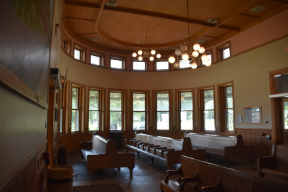 Nearly all window frames, trim, and exterior doors are original. The perimeter benches and panelling on the first floor are original and made of quarter-sawn oak. The two large freestanding benches are reproductions based on historic photographs and the second floor is made of yellow cypress. Originally, all the floors in the building were of tongue-and-groove strips of white maple. During 1964 modernization, cream and black terrazzo were added on top of the maple on the first floor; the mezzanine and second floor retain most of their original maple flooring.
