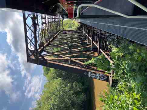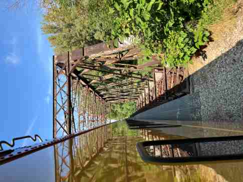 Green River Bridge milepost 169.3. The Green River has closely followed the Rock Island Railroad to the north. When Henry County was drained, the Green River was straightened and channelized as part of the work. The river flows a few miles further south and west before entering the Rock River south of Carbon Cliff. The bridge, from east to west, include a 150-foot lattice through truss span and then five deck plate girder spans of 36' 8" each. The truss was built in 1900 and the bridge is a total of 340 feet long. The Iowa Interstate uses the former south track's alignment over the bridge.
