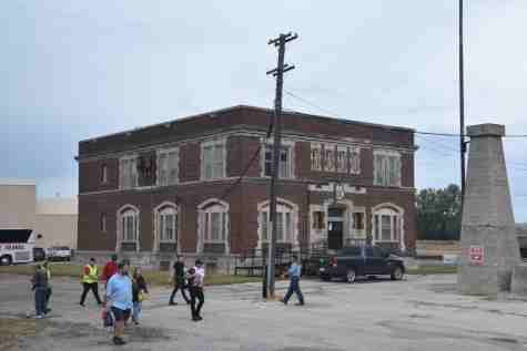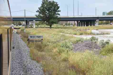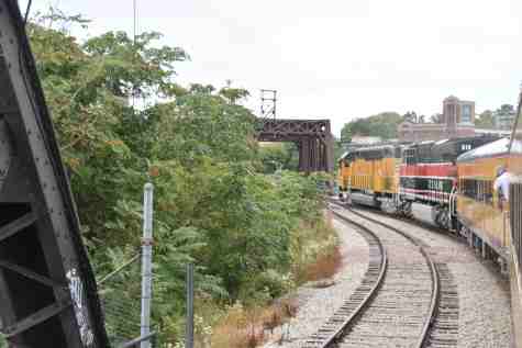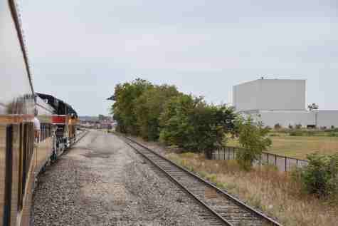 A few of the many passengers making their way to the boarding area. The brick building is National Railway Equipment's office, housed in a former Chicago, Rock Island and Pacific building; NRE used to own the former Rock Island shops here.