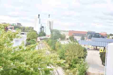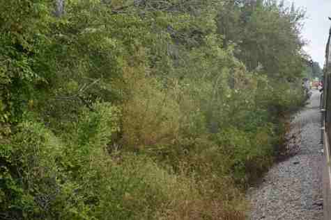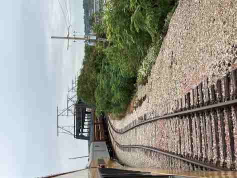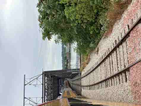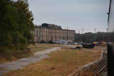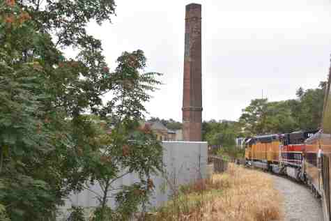 Rounding a curve before street running, passing the photographers and an old smokestack of unknown origin.