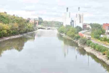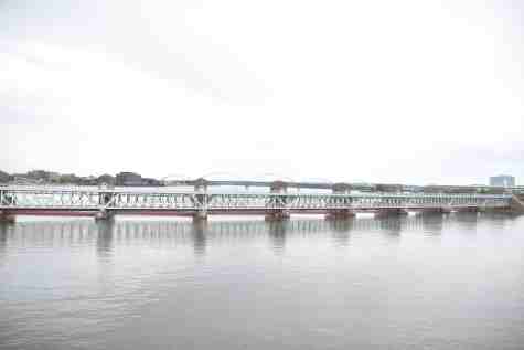 Crossing the Mississippi River on the Arsenal Bridge, with the Centennial bridge in the background.