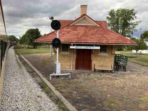 Passing the diagonally-centered West Liberty depot at Milepost 221.3. The town was named for Liberty, Ohio, with the word "west" added as it was west of Ohio.