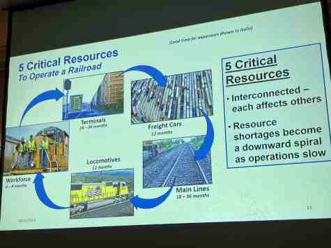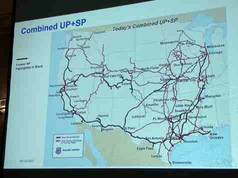 After the banquet, Mike Hemmer (retired Union Pacific Senior Vice President of Law/General Counsel) and Tom Haley (retired Union Pacific Vice President of Network Planning and Operations) gave a presentation titled "Houston, We Have a Problem" which explored the causes and remarkable recovery from the catastrophic system-wide service crisis after the UP/SP merger. These are five slides from that presentation. To round out the evening, the raffle and silent auction winners were announced and some old Union Pacific commercials were shown.
