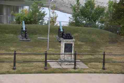 The cannons commemorate the site of Fort Armstrong, one of a chain of western frontier defenses which the United States erected after the War of 1812. It was located at the foot of Rock Island, in the Mississippi River and was five miles from the principal Sauk and Meskwaki village on the Rock River in Illinois. Of stone and timber construction, 300 feet square, the fort was begun in May 1816 and completed the following year, consisting of three large blockhouses on its prominent corners In 1832, the U.S. Army used the fort as a military headquarters during the Black Hawk War. It was normally garrisoned by two companies of United States Army regulars. With the pacification of the Indian threat in Illinois, the U.S. Government ceased operations at Fort Armstrong and the U.S. Army abandoned the frontier fort in 1836.