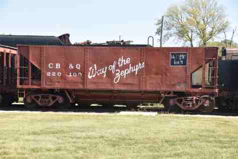 Chicago Burlington and Quincy car ballast 220145, built by American Car & Foundry in 1927, for hauling rock ballast and other aggregate. Very similar to a standard hopper car, ballast cars were designed with doors in the bottom set to dump the car's contents to the side of the tracks.