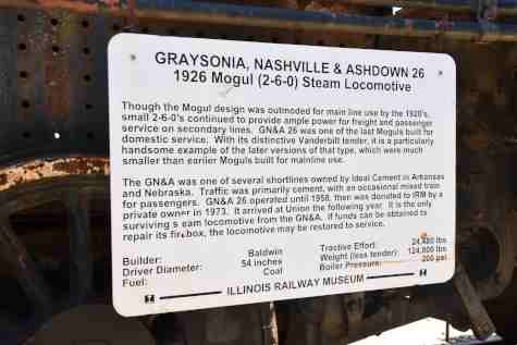 Graysonia Nashville & Ashdown 2-6-0 26, ex. privately owned in Concordia, Kansas 1960-1973, exx. Nebraska-Kansas Railroad 26 1952-1960, exxx. Graysonia Nashville & Ashdown 26 ?-1952, nee Graysonia Nashville & Ashdown 203, built by Baldwin Locomotive Works in 1926.
