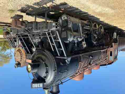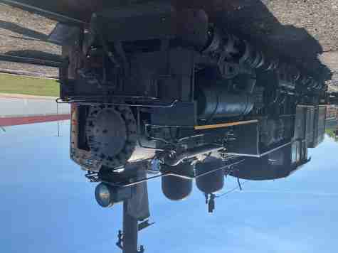J. Neils Lumber Company three-truck Shay 5, ex. privately owned 1964-1965, exx. Klickitat Log & Lumber Company 5 ?-1964, exxx. St. Regis Paper Company 5 1957-?, J. Neils Lumber Company 5, built by Lima Locomotive Works in 1929. It was designed with three cylinders mounted vertically on the engineer’s side that power a drive shaft running the length of the engine alongside the wheels. This allows all wheels to be powered using bevel gears. Shays were extremely slow but were powerful and could negotiate uneven track and sharp curves, making them popular with logging and mining companies.