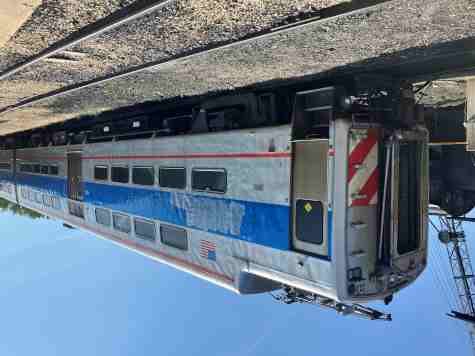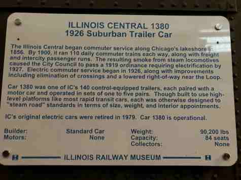 Illinois Central unpowered trailer 1380, built by Pullman/Pullman-Standard in 1926. When new, it replaced aged steam locomotives on the suburban line south of Chicago and was always coupled to a self-propelled motor car to create a two-car motor-trailer set.