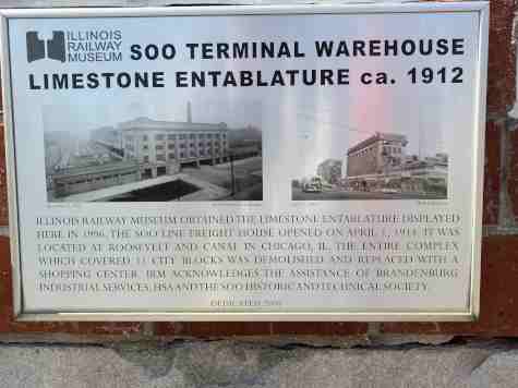 Minneapolis, St. Paul and Sault Ste. Marie limestone entablature, obtained in 1996 from the Soo Line freight house located at Roosevelt and Canal Streets in Chicago, which opened on April 1, 1914. The entire complex, which covered 11 city blocks, was demolished and replaced with a shopping center.