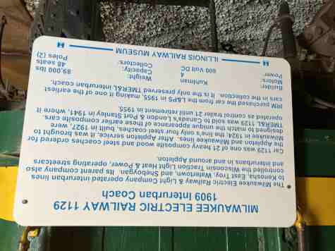 Milwaukee Electric single end/double truck/railroad roof coach 1129, ex. London and Port Stanley 21 1941-1955, exx. Milwaukee Electric Railway & Transport Company 1129 1938-1941, nee Milwaukee Electric Railway & Light Company 1129, built by the company in 1924. It is the last surviving interurban coach operated by Wisconsin's largest interurban system and originally constructed in 1909 as a wooden coach, but it was completely torn down and rebuilt by the Milwaukee Electric as a modern interurban car in 1924. Retaining only its basic wood frame, the car acquired a new roof, interior and steel sheathing. It was acquired by IRM in 1955 as one of the museum's first cars.