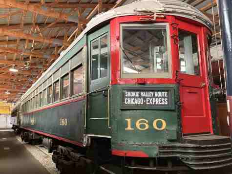Chicago, North Shore and Milwaukee steel interurban coach 160, nee Chicago and Milwaukee Electric 160, built by J. G. Brill Company in 1915. It is the oldest North Shore passenger car preserved and the only car at IRM from the railroad's first order for steel interurban cars. It saw nearly 50 years of service, remaining in use until the North Shore was abandoned in 1963. It has been restored to its appearance during the 1940s when it was used on the Shore Line between Chicago and Waukegan.