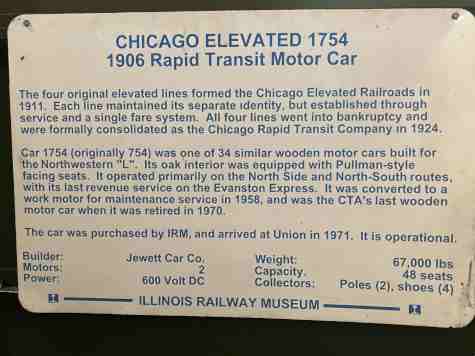 Chicago Elevated Railway wood-bodied "L" car 1754, ex. Chicago Transit Authority S333 1958-1971, exx. Chicago Transit Authority 754 1947-1958, exxx. Chicago Rapid Transit 754 1924-1947, exxxx. Chicago Elevated Railway 754 1913-1924, nee Northwestern Elevated Railroad 754, built by Jewett Car Company in 1906. It is the only preserved rapid transit car built by the Ohio company that specialized in interurban cars, and was one of the earliest "L" cars built with extra-wide doors for reducing dwell time at stations. It was retired in the 1950s and converted to a utility car, a role which it served into the 1970s.