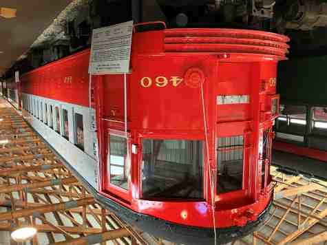 Chicago Aurora and Elgin interurban car 460, ex. Lake Shore Electric Railway in Cleveland, Ohio 2006-2010, exx. Trolleyville USA in North Olmsted, Ohio 1962-2006, nee Chicago Aurora & Elgin 460, built by St. Louis Car Company in 1945. It is the last traditional interurban car built in the United States. The CA&E ordered ten modern curve-side coaches in 1941 but the cars were not completed until 1945 due to World War II. Cars 451-460 featured lightweight design and newer electric control systems, but could be used together with the line's old 1920s steel coaches. Car 460 has been restored to its appearance when the CA&E abandoned passenger service in 1957.
