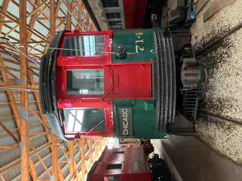 Chicago, North Shore & Milwaukee interurban coach 714, built by Cincinnati Car Company in 1926. It operated until 1963 in daily service, in trains of up to eight cars. Shortly after the railroad abandoned operations, car 714 came to IRM and it has been restored to its 1950s appearance.