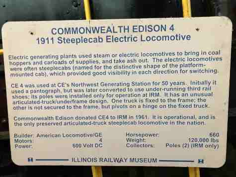 Commonwealth Edison "steeplecab" electric locomotive 4 built by American Locomotive Company and General Electric in 1911. It hauled coal trains around the Northwest Generating Station in Chicago for 50 years until acquired by IRM in 1962.