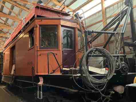 Chicago North Shore & Milwaukee overhead line car 604, nee Chicago and& Milwaukee Electric 604, built by the railroad in 1914. It is the oldest surviving piece of equipment from the North Shore Line. Line cars were unique to electric railways but were ubiquitous, as the extensive network of overhead wires required regular maintenance and repair in order to keep it in good condition. Even the earliest electric railways in the 1880s used overhead wires to power streetcars; the very word "trolley" derives from a troller, a small cart that balanced atop paired wires in one early design for an electric railway system. During the height of the electric railway era in the early 1900s, the vast majority of electric railways used overhead wires to power their trains.