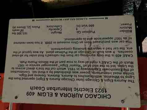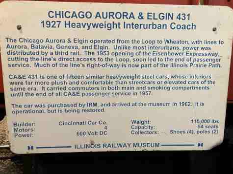 Chicago, Aurora and Elgin heavyweight steel interurban coach 431, built by Cincinnati Car Company in 1927 for high-speed service between Chicago and the Fox River Valley. It has been restored to its appearance in the mid-1950s.