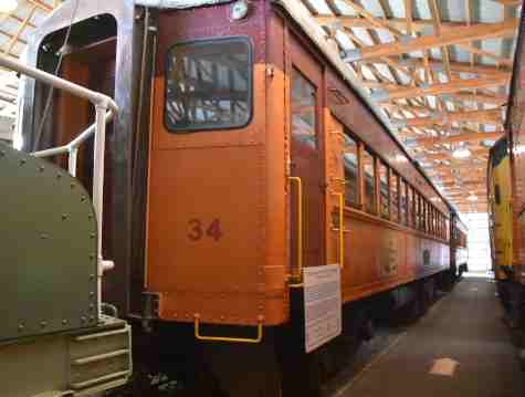 Chicago, South Shore and South Bend line steel coach 34, built by Standard Steel Car Company in 1929 for service between Chicago and South Bend. It saw over 50 years of service, not being retired until 1984.