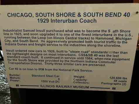 Chicago, South Shore and South Bend interurban coach 40, ex. National Park Service 1984-1988, exx. Chicago South Shore and South Bend 40 1938-1984, nee Chicago South Shore and South Bend 213, built by Standard Steel Car Company in 1929 designed for service between Chicago and South Bend. It was originally built as an unpowered trailer but was motorized and renumbered as car 40 in 1938. It remained in service for more than 50 years.