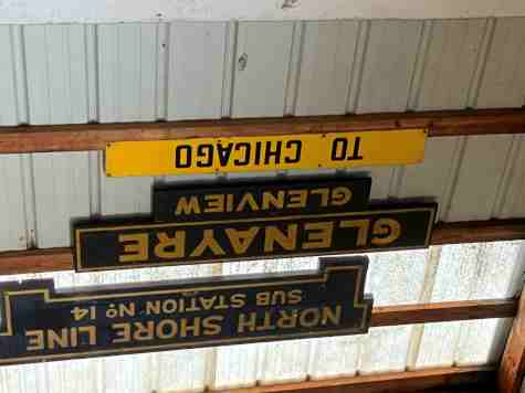 A variety of electric railway signs on the wall as we exited. Lunch was set up at the pavilion, consisting of make-your-own sandwich with potato salad and baked beans, as well as dessert. Fortified, we continued exploring.
