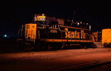 1976 -- A night shot of Santa Fe GP35 3318, nee Santa Fe 1318:1 built by Electro-Motive Division in 1964 at Santa Ana. It was rebuilt to GP35u 2818:3 in November 1984, then became SPSF 3576 from July 1985 to July 1986. Before January 1991, it was re-numbered Santa Fe 2818:3 then became BNSF 2518 in 1998 and is currently BNSF GP39-3 2623.
