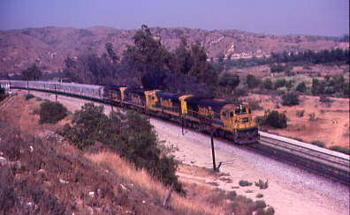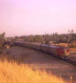 Amtrak 3 the Southwest Chief rerouted on January 1st due to the Rose Bowl Parade in Pasadena rolls west through Fullerton in 1984.