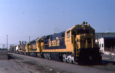 Santa Fe 5590 with a B&O renumbered 4049 coming through Santa Ana in 1984.