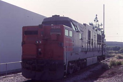 1982 -- Santa Fe C30-7 8014, built by General Electric in 1977, coming down the siding in front of the Santa Ana depot.